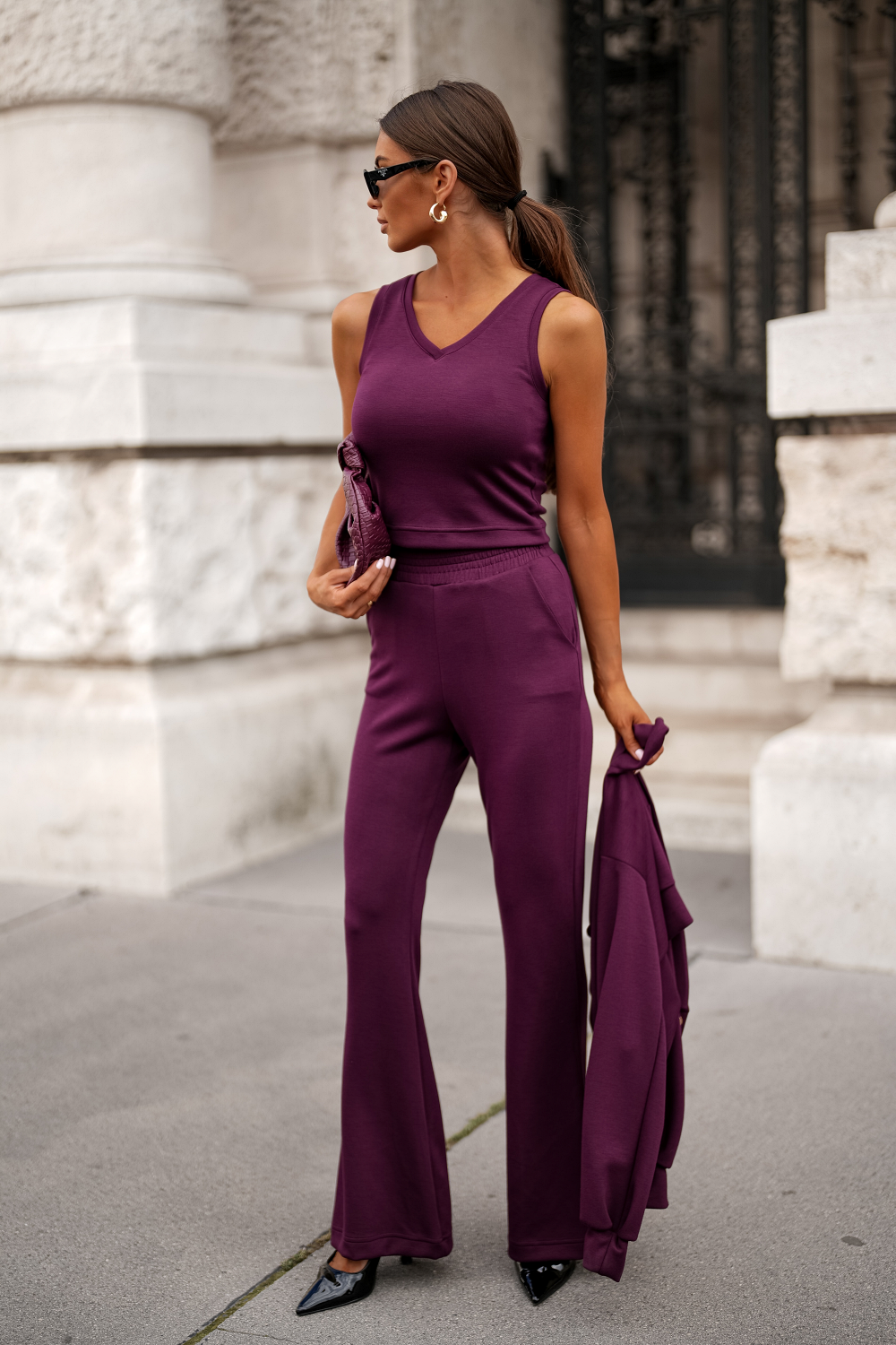Komplet wykonany jest z materiału o składzie 95% wiskoza oraz 5% elastan, co zapewnia odpowiednią elastyczność oraz trwałość. Idealny do zestawień zarówno z butami na obcasie, jak i sportowymi, KOMPLET LISSA Fiolet z pewnością stanie się Twoim ulubionym elementem garderoby.
