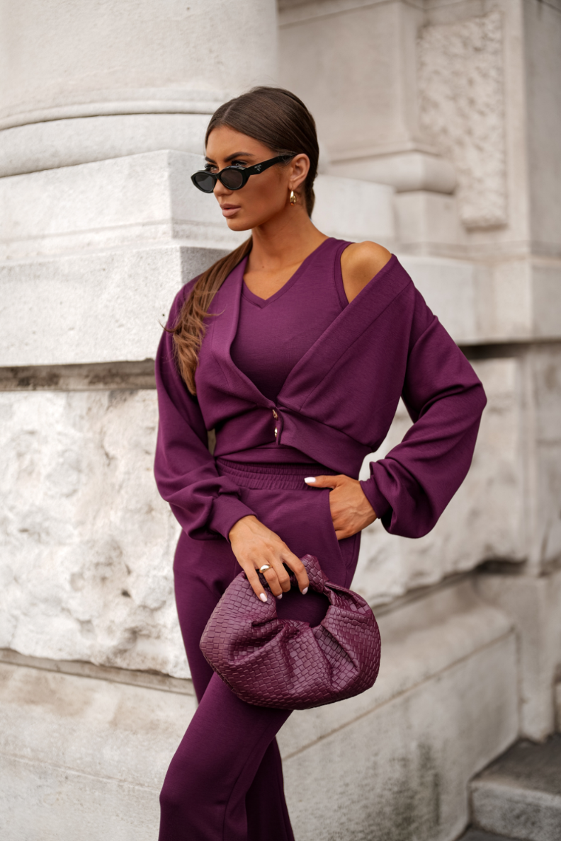 Komplet LISSA Fiolet to elegancki zestaw odzieżowy, który łączy w sobie styl i komfort. Wykonany z wysokiej jakości materiałów, idealnie wpisuje się w obecne trendy mody, jednocześnie zapewniając wygodę noszenia. Komplet składa się z bluzki oraz spodni, które możesz zestawiać zarówno na co dzień, jak i na specjalne okazje.