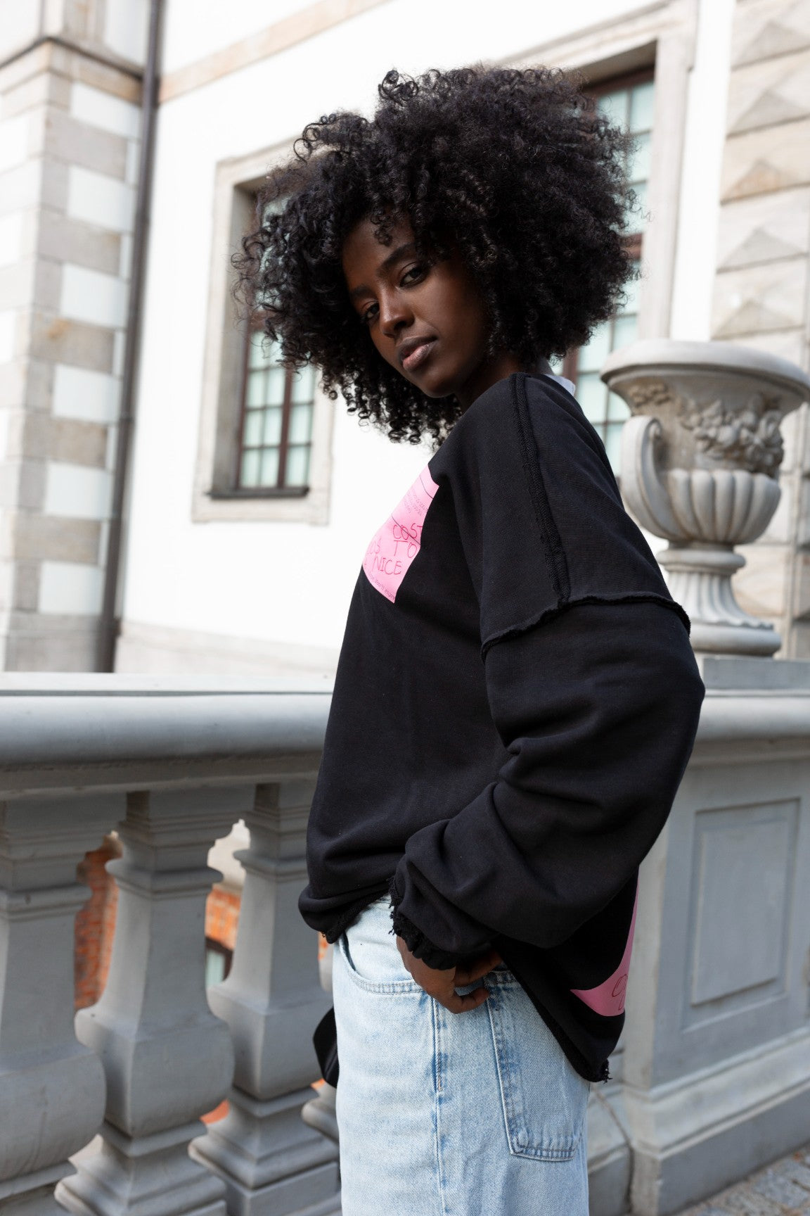 Bluza dresowa - oversize z sitem w formie paragonu - Czarna z Różowym