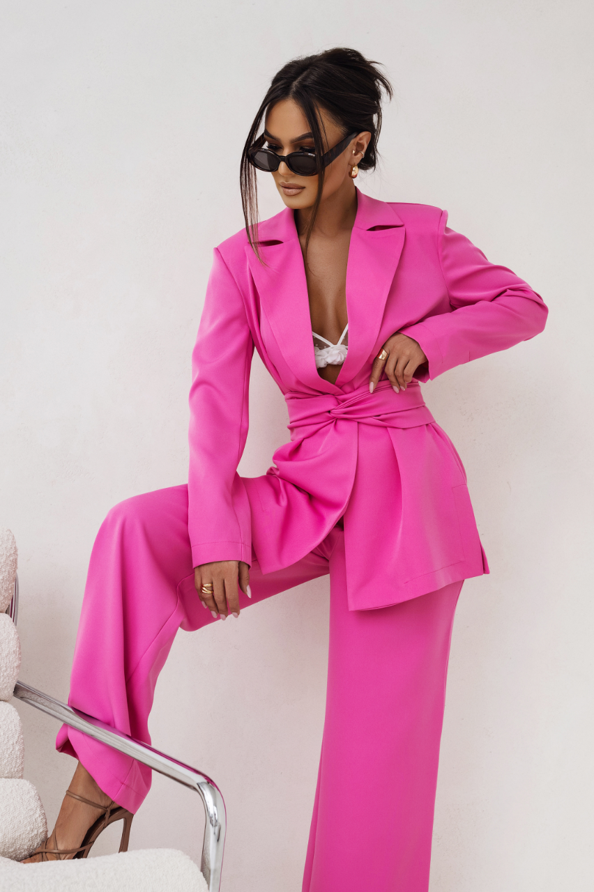 Garnitur EMMA w kolorze różowym to elegancka propozycja dla kobiet, które cenią sobie zarówno styl, jak i wygodę. Wykonany z wysokiej jakości materiałów, ten garnitur łączy w sobie nowoczesny design oraz klasyczną formę, co czyni go idealnym wyborem na różnorodne okazje – od codziennych spotkań po formalne wyjścia.